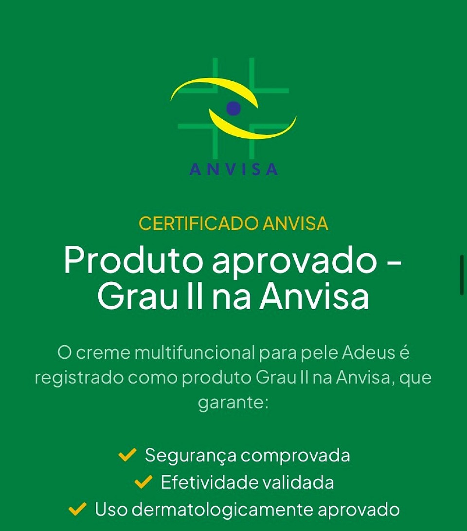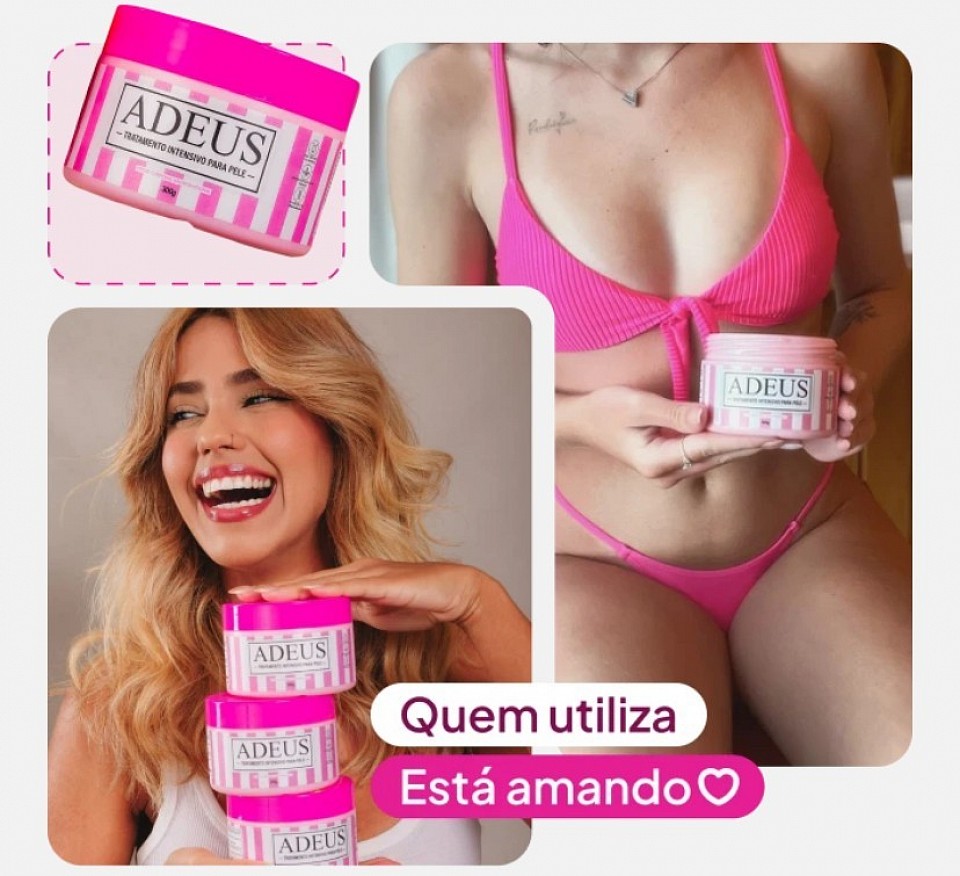 Descubra o poder de ADEUS — um tratamento intensivo desenvolvido para transformar sua pele. Com ação comprovada contra estrias vermelhas e brancas, celulite e flacidez, ADEUS também auxilia na redução de medidas e promove uma melhora visível no aspecto da pele desde as primeiras aplicações. Sua fórmula reúne ingredientes potentes e seguros, capazes de nutrir, hidratar e revitalizar profundamente. O resultado? Uma pele mais firme, lisa e uniforme. Mais do que um creme, ADEUS é a escolha de milhares de mulheres que estão recuperando sua autoestima e a liberdade de mostrar o corpo sem medo.